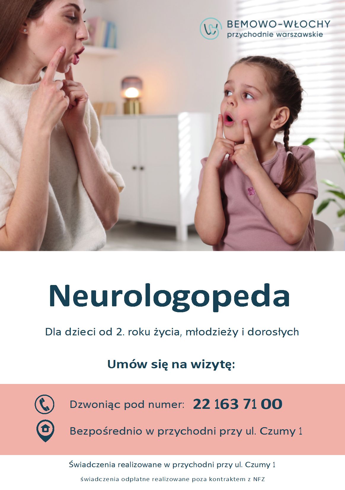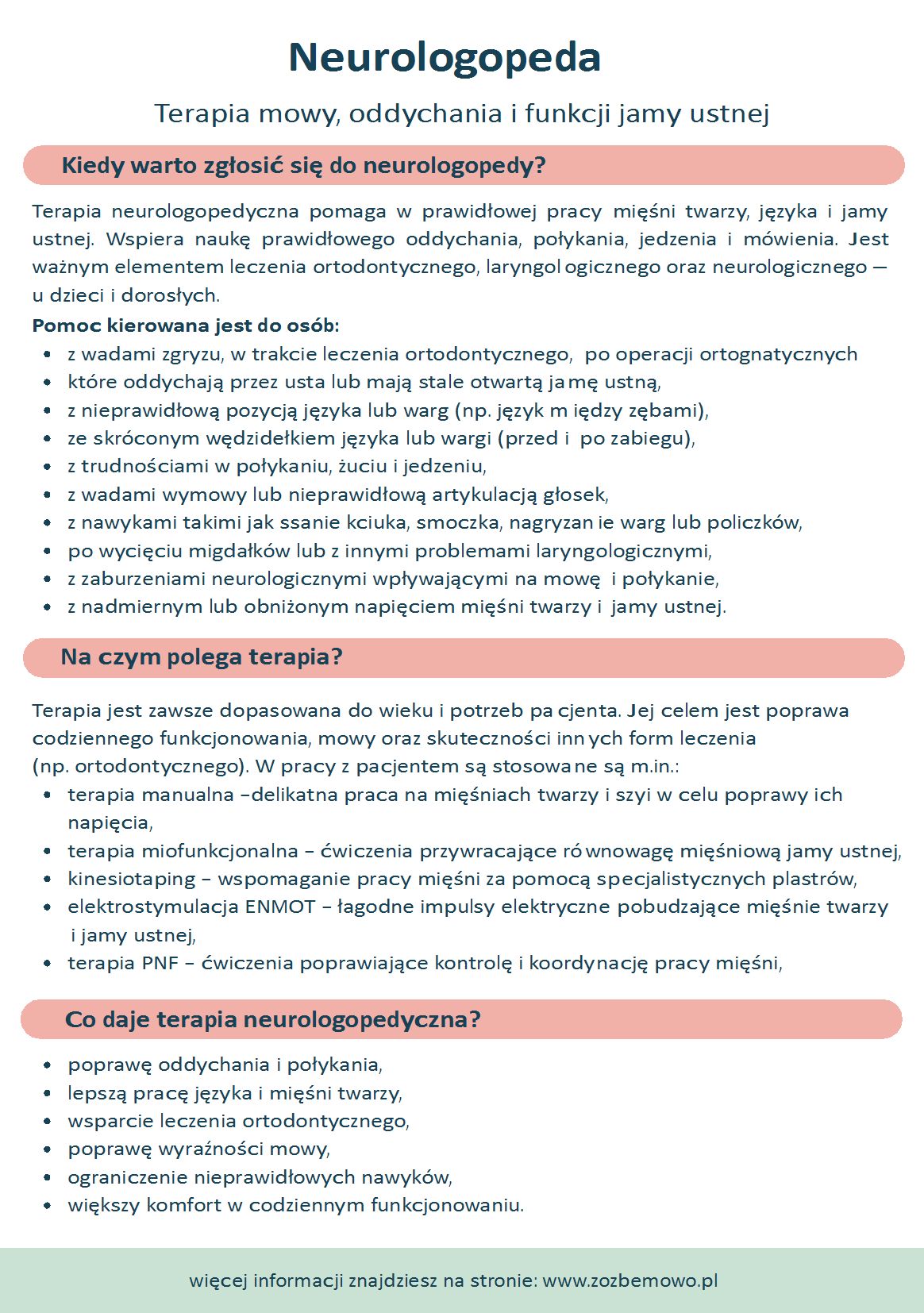 Neurologopedia obejmuje diagnostykę i terapię zaburzeń mowy, oddychania, połykania oraz pracy mięśni twarzy i jamy ustnej. Świadczenia kierowane są do dzieci od 2. roku życia, młodzieży oraz osób dorosłych.